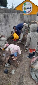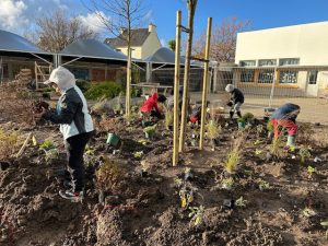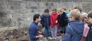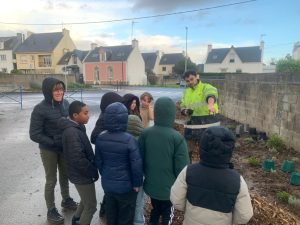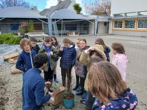Dans le cadre des travaux d’aménagement de la cour, tous les élèves de primaire ont eu la chance de participer à une séance de plantation aux côtés d’Ewen, le
