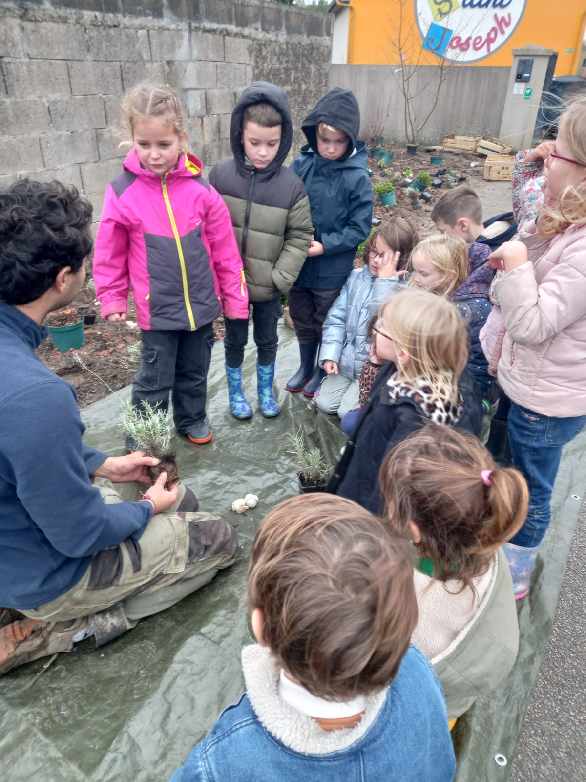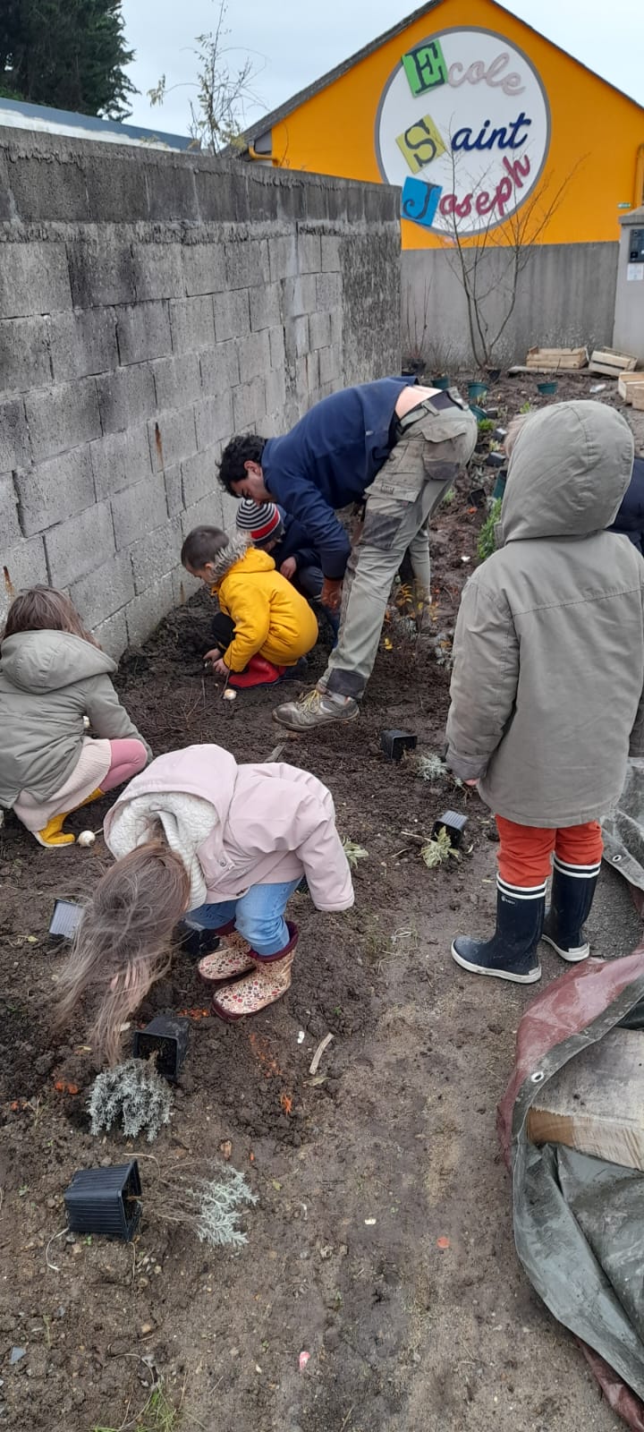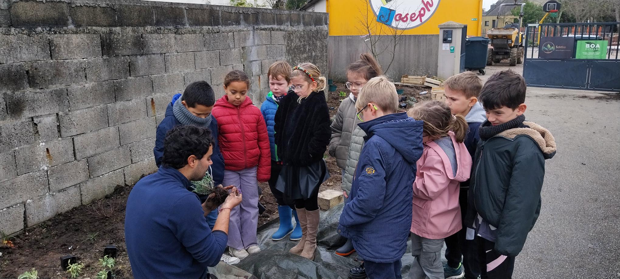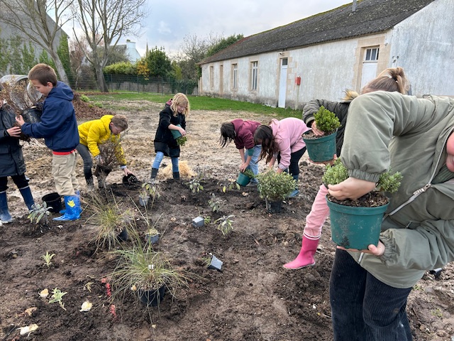 Dans le cadre des travaux d’aménagement de la cour, tous les élèves de primaire ont eu la chance de participer à une séance de plantation aux côtés d’Ewen, le