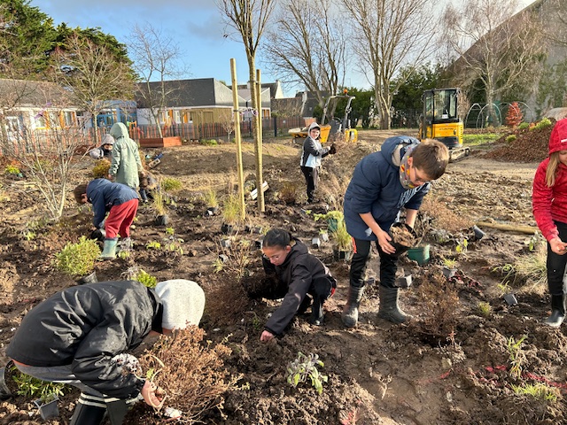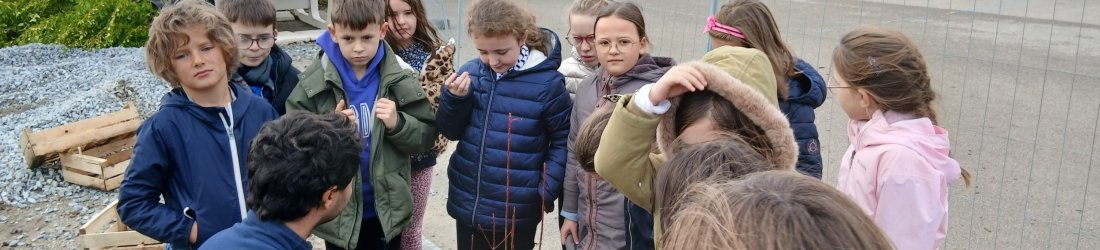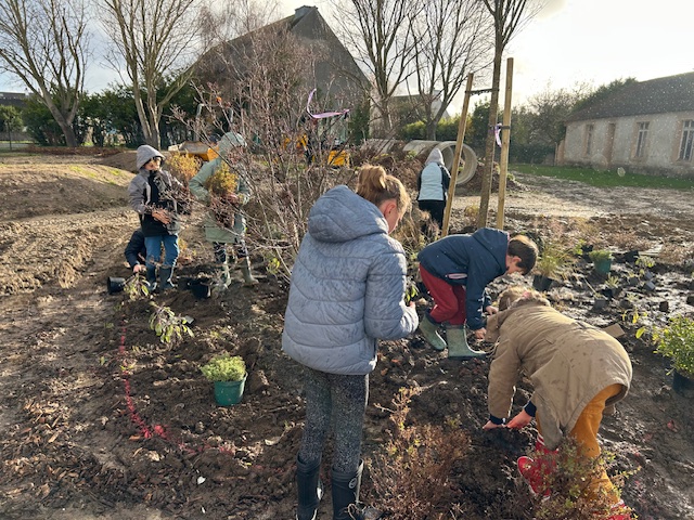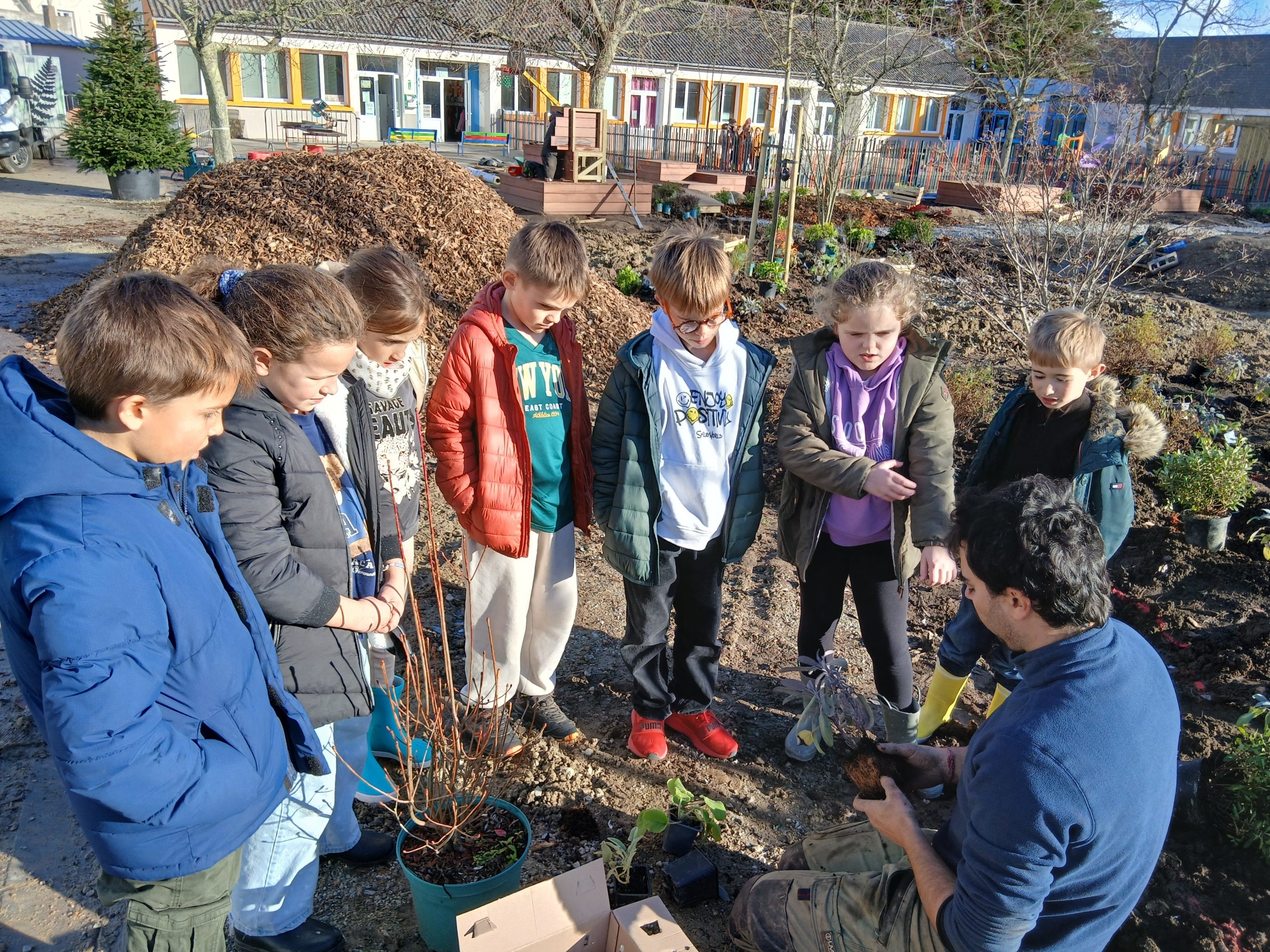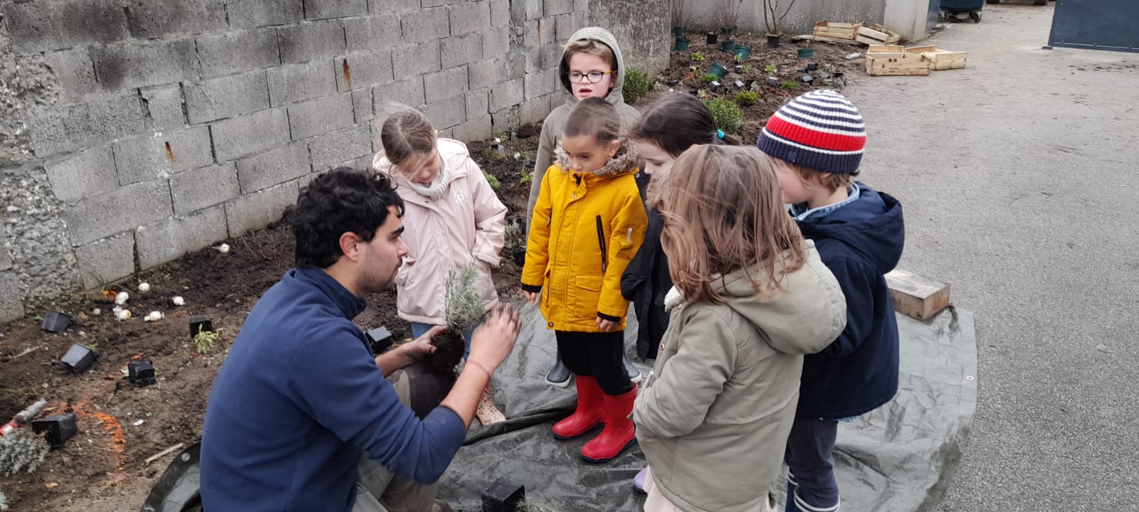 Dans le cadre des travaux d’aménagement de la cour, tous les élèves de primaire ont eu la chance de participer à une séance de plantation aux côtés d’Ewen, le