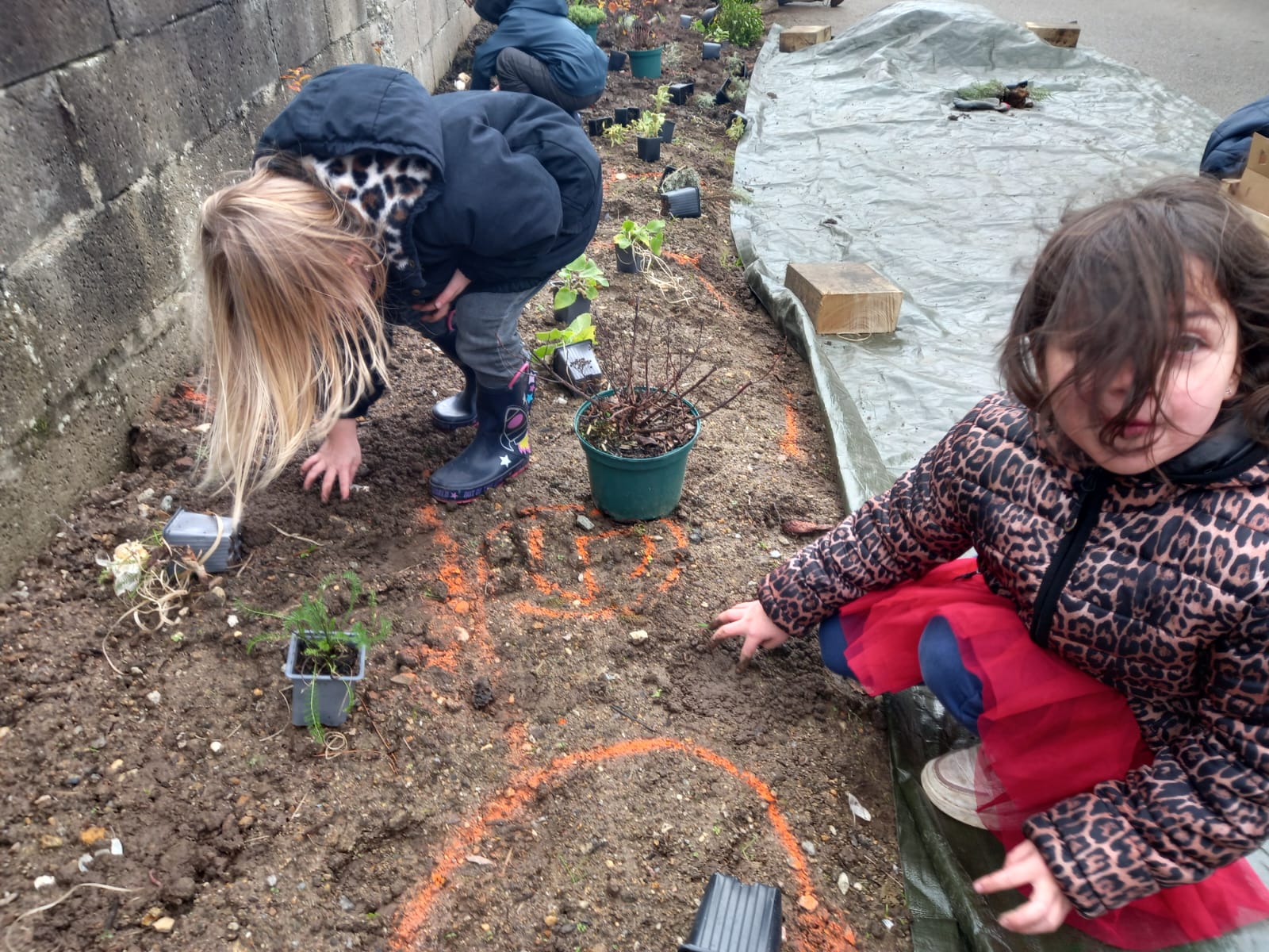 Guidés par ses conseils, les enfants ont planté des graines, bulbes et jeunes plants dans différents espaces de la cour, mais aussi à l’entrée de l’école.