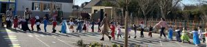 Pour terminer la matinée, les élèves sont sortis sur la cour et ont dansé, ils ont fait des farandoles en écoutant des musiques et chansons entrainantes sous un beau soleil.