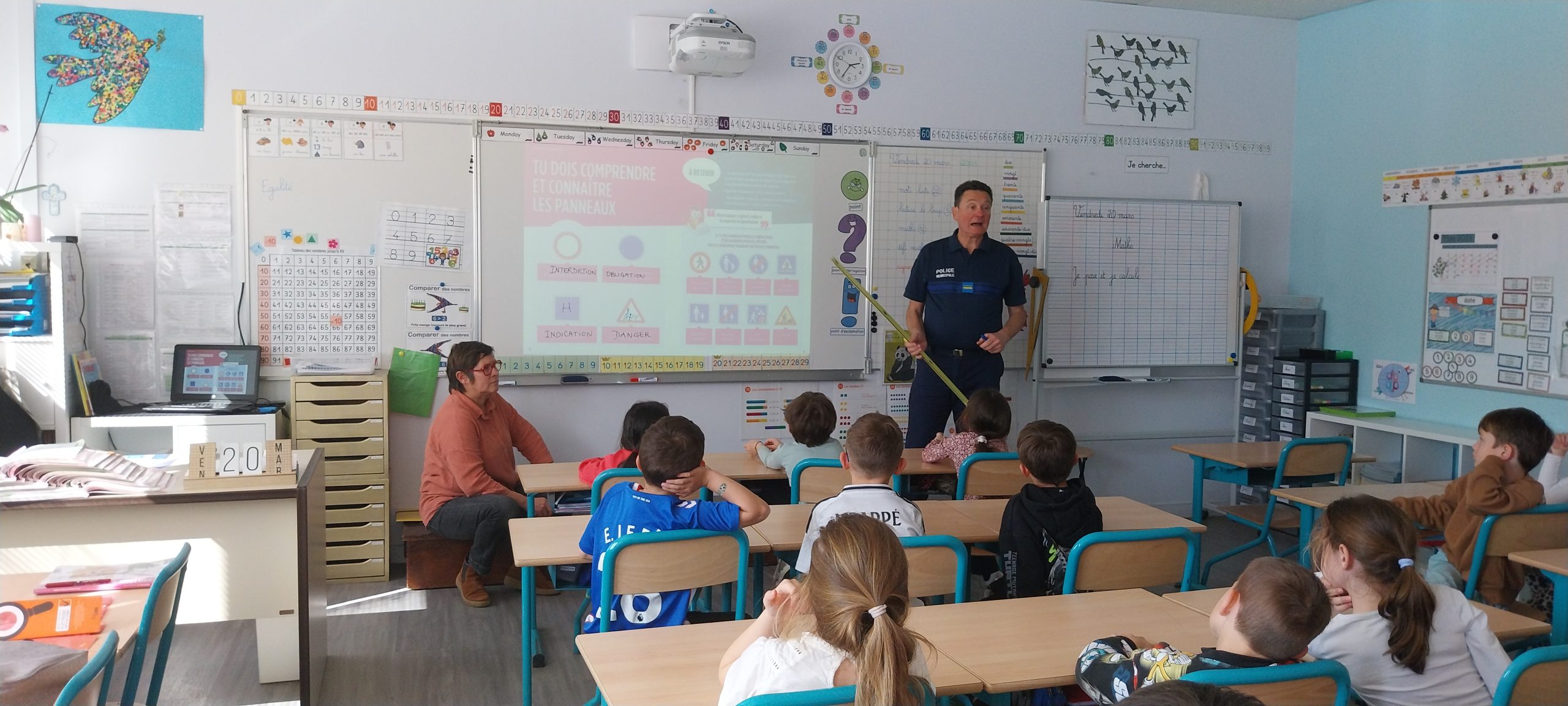 Dans le cadre de l’éducation à la sécurité routière, les élèves de CP-CE1 ont eu la chance de bénéficier de l’intervention de Monsieur Pascal Calegari, policier municipal, accompagné d’Isabelle