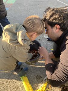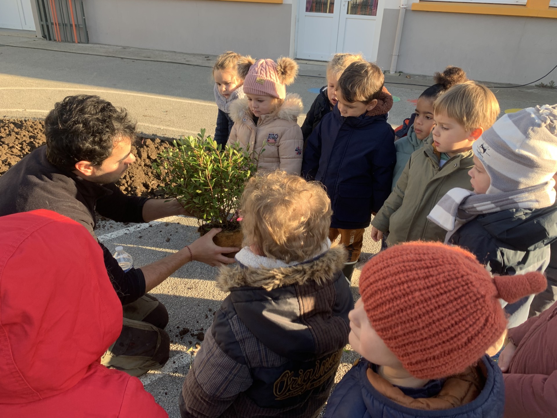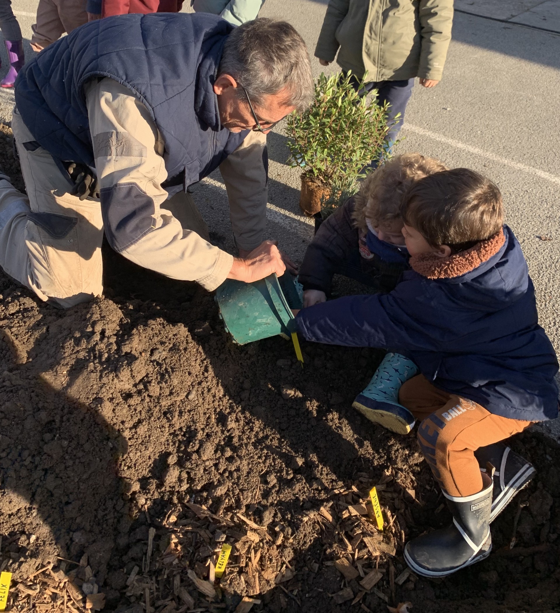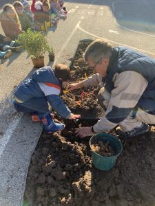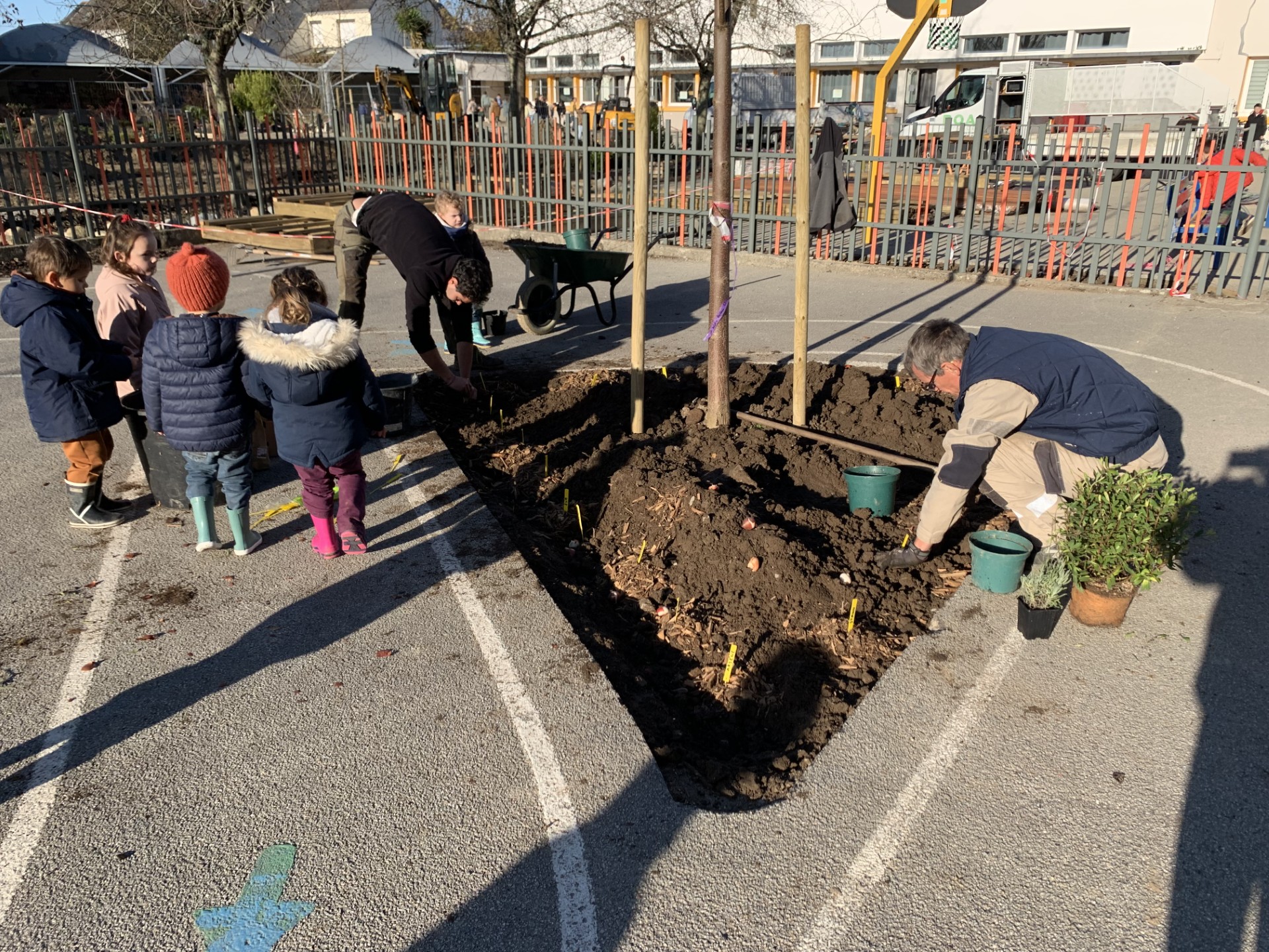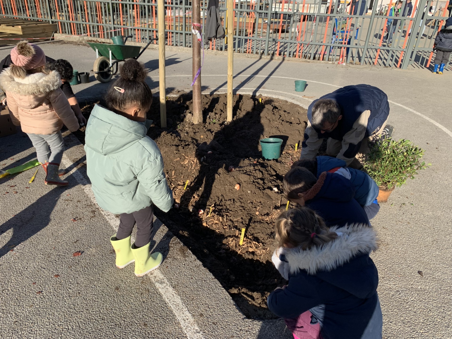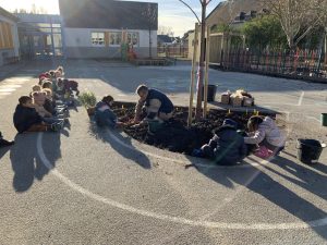 Ce matin, avec Ewen (le paysagiste qui travaille à l’école pour nous faire une belle cour), nous avons participé à l’aménagement de la bordure sous l’arbre de la cour maternelle.