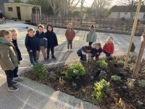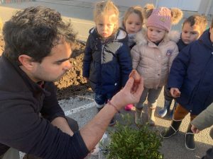 La maîtresse a écrit nos prénoms sur une étiquette pour que l’on reconnaisse nos fleurs quand elles auront poussé.